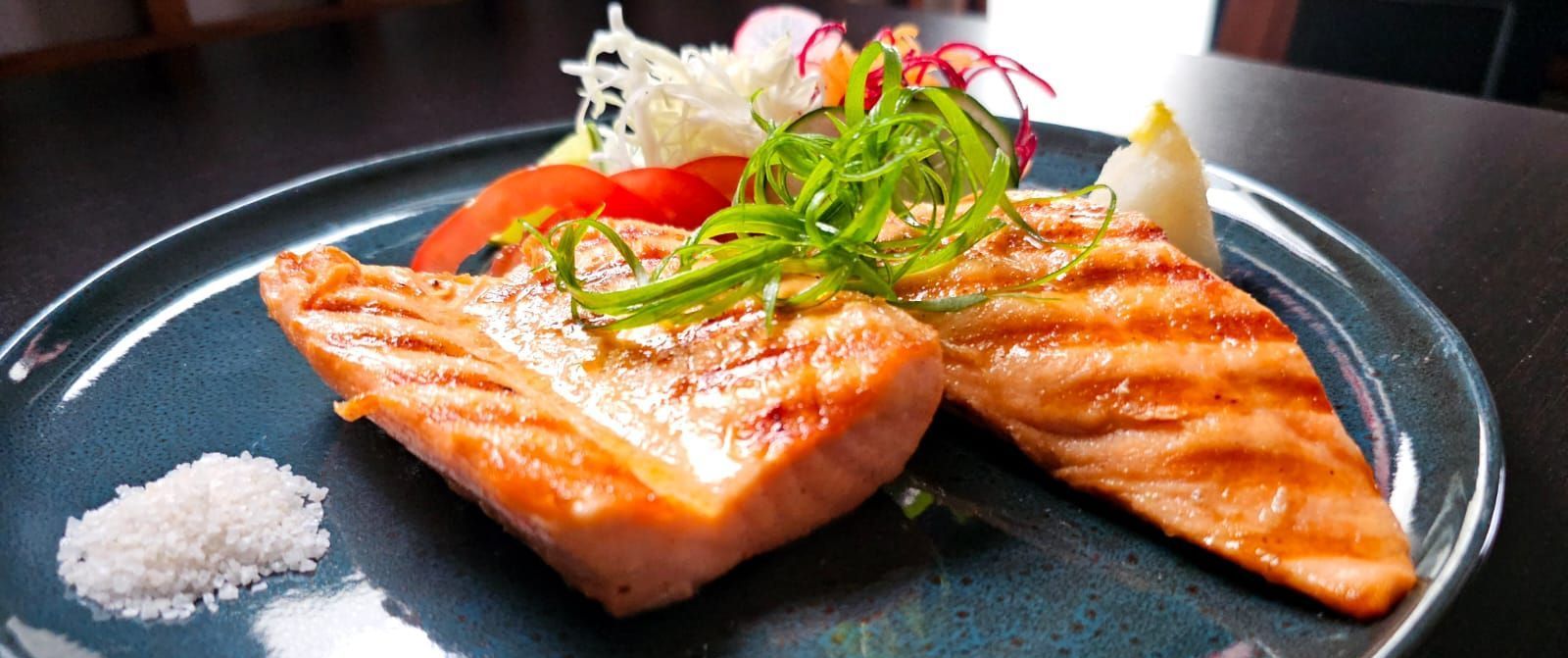 香ばしく炙った鮪の薄切りを、オーガニックレタスの上に盛り付け、キュウリ、ニンジン、ブロッコリーを添えたヘルシーな一品です。