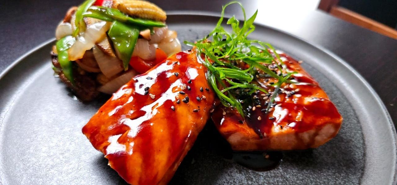 新鮮な魚の切り身に、赤タマネギとパクチーを合わせ、醤油ベースのソースと東洋風スパイスでマリネしました。