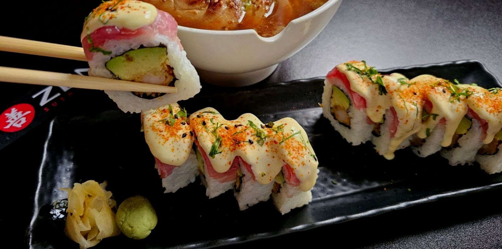 エビフライ、アボカド、クリームチーズを巻き、外側にマグロまたはサーモンのタルタルをのせ、スパイシーソースで仕上げたロール寿司。クリーミーなコクとピリッとした辛味が調和した一品です。